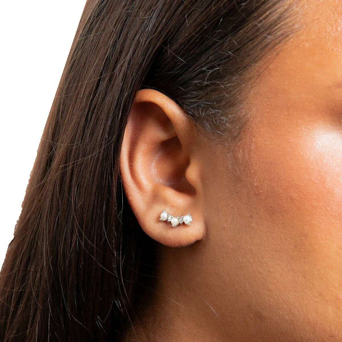 Beginnings 湾曲した淡水真珠とクリスタルクローラーイヤリング - 銀/白