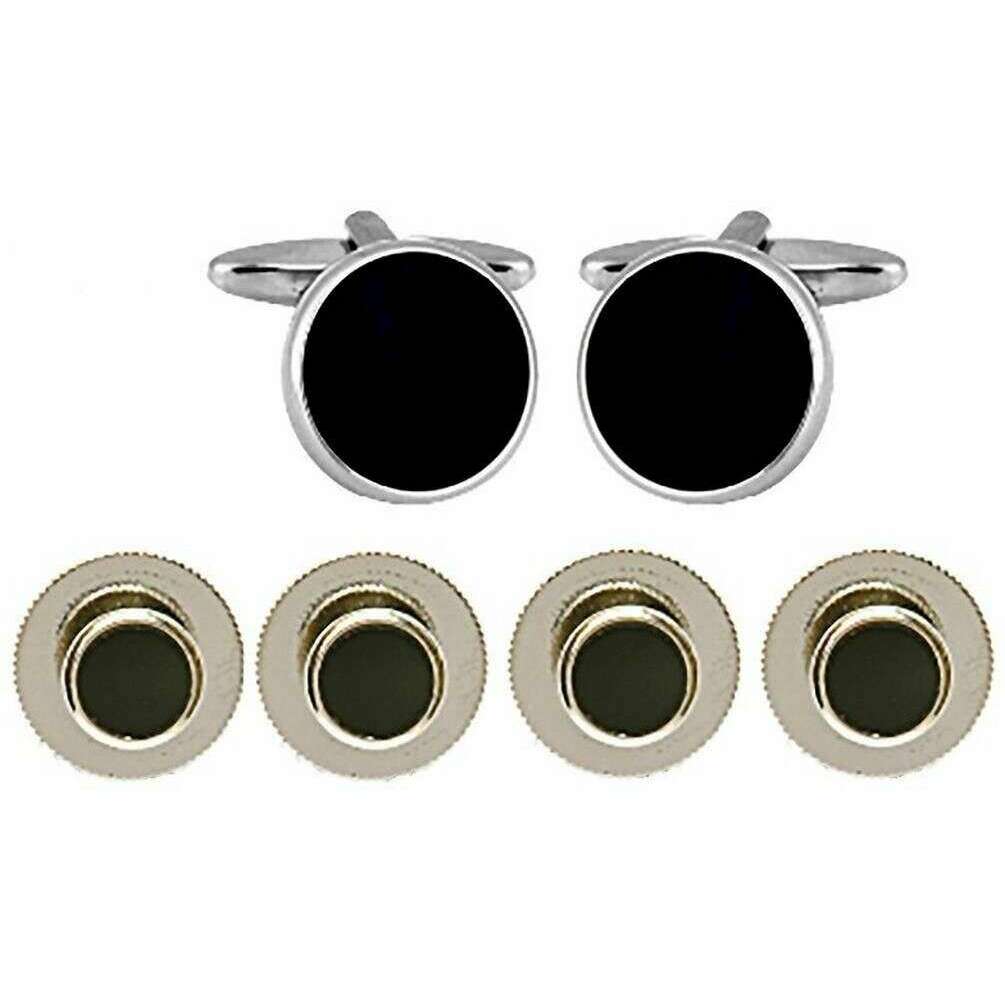David Van Hagen ラウンド カフスとドレス スタッド セット - ブラック/シルバー