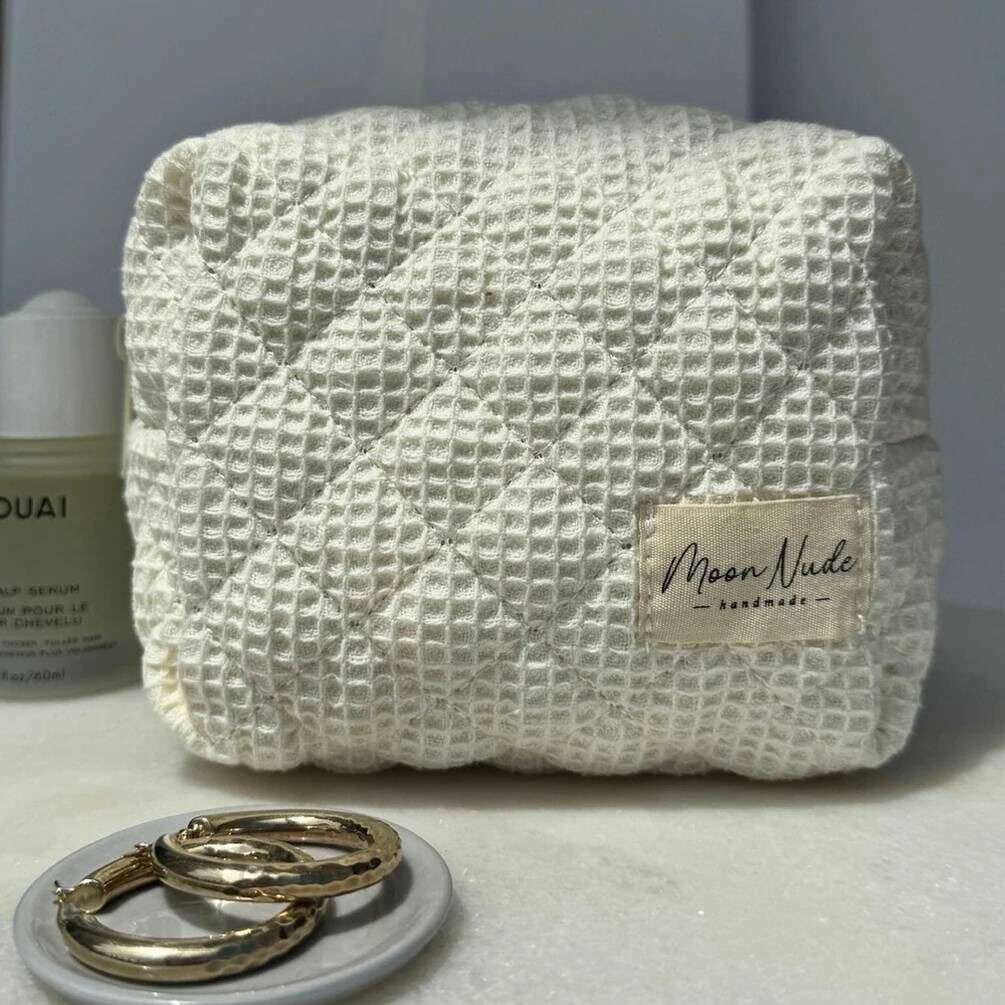 コットン100%のクリームを使用したムーンヌードのミニ化粧ポーチは、女性にぴったりの必需品です。大きさは13cm(高さ)×15cm(幅)×11cm(奥行き)です。中性洗剤を使用し冷水で手洗いするか、裏返しにしてデリケート洗いすることをお勧めします。このバッグを良好な状態に保つために。すべてのバッグにはムーンヌードパッケージが付属しています。 Moon Nude ミニ メイクアップ バッグ - クリームは、お部屋や毎日のバッグに絶対の必需品です。この化粧ポーチは、よく使う製品をすべてまとめて安全に保管できると同時に、手作りのキルティングデザインでスタイリッシュでシックです。