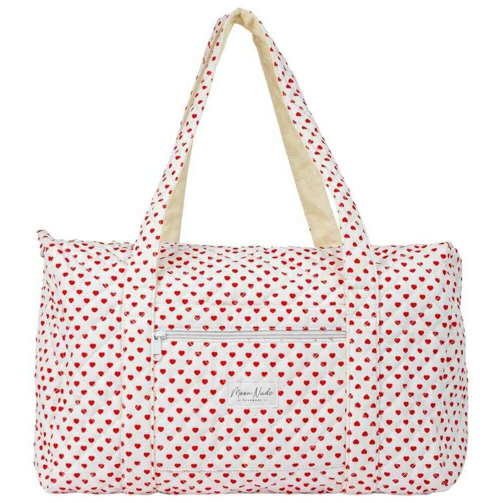デザイナー Moon Nude による、コットン 100% のこの白/赤の女性用バレンタイン ラージ ダッフル バッグです。サイズは30cm(高さ)×50cm(幅)×28cm(奥行き)です。中性洗剤を使用し冷水で手洗いするか、裏返しにしてデリケート洗いすることをお勧めします。このバッグを良好な状態に保つために。すべてのバッグにはムーンヌードパッケージが付属しています。 Moon Nude Valentine ラージ ダッフル バッグ - ホワイト/レッドは、美しい手作りのキルティング デザインが特徴です。このバッグは、外側のジッパー ポケット、広々とした内側、2 つの大きなハンドルが特徴で、週末の旅行やたくさんの持ち物を持ち運ぶのに最適です。
