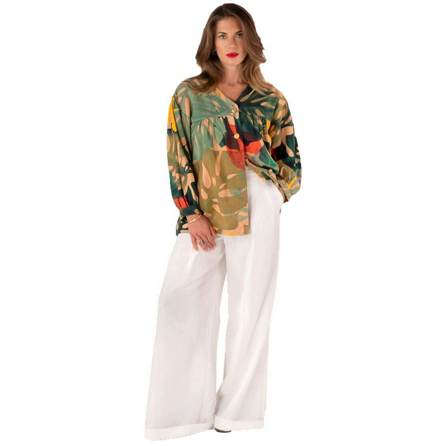 • 裾上げ袖 , ボタンアップ , V-ネックカラー