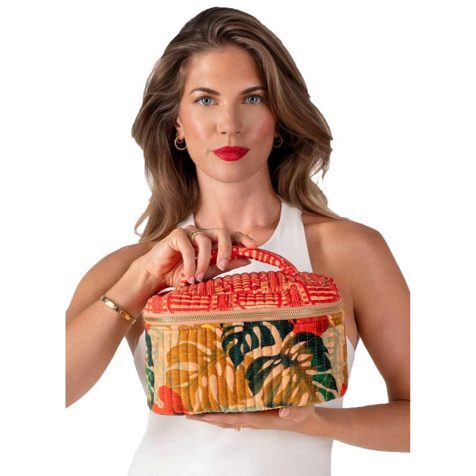 パウダー エキゾチック リーフ キルティング バニティ ケース - レッド/グリーン/ベージュ