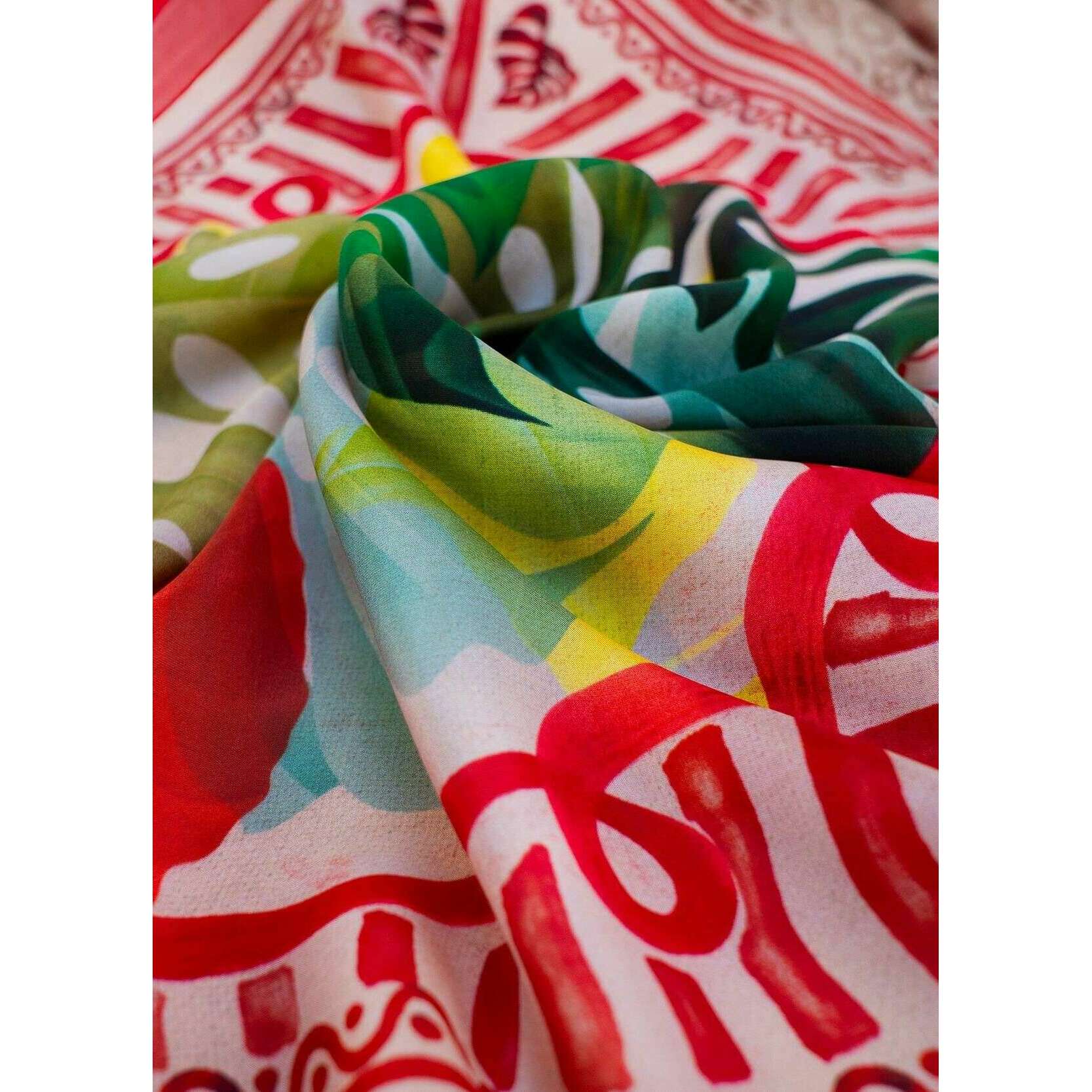 パウダー エキゾチック リーフ シルク スクエア スカーフ - レッド/ベージュ/グリーン