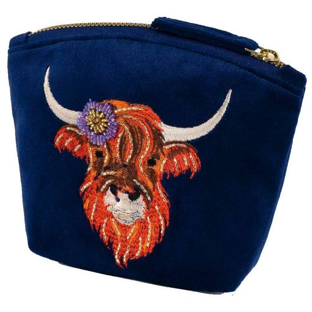 パウダーハイランドカウ刺繍入りベルベットミニポーチ - ネイビーブルー/オレンジ/ベージュ