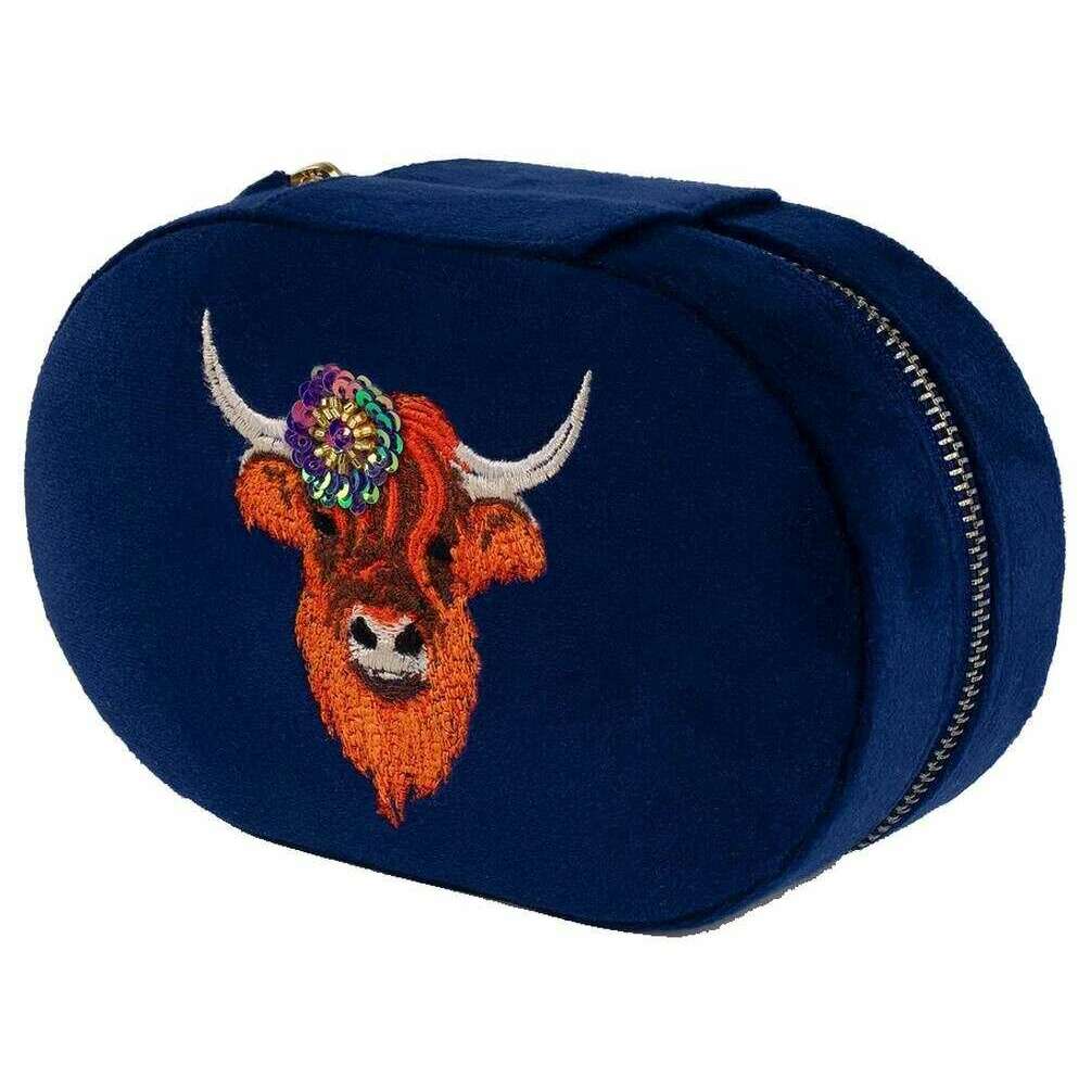 パウダー ハイランド カウ オーバル ジュエリー ボックス - ネイビー ブルー/オレンジ/ベージュ