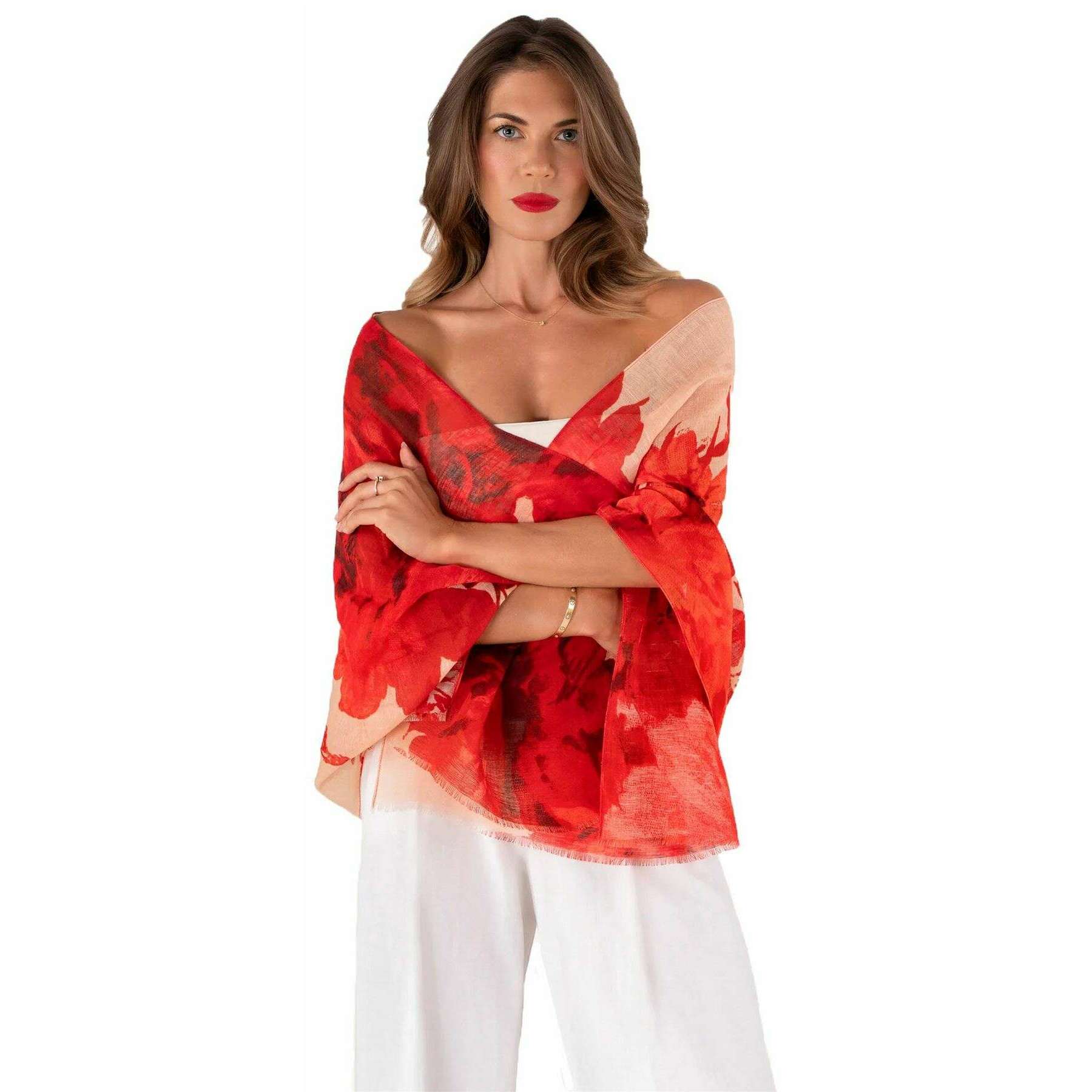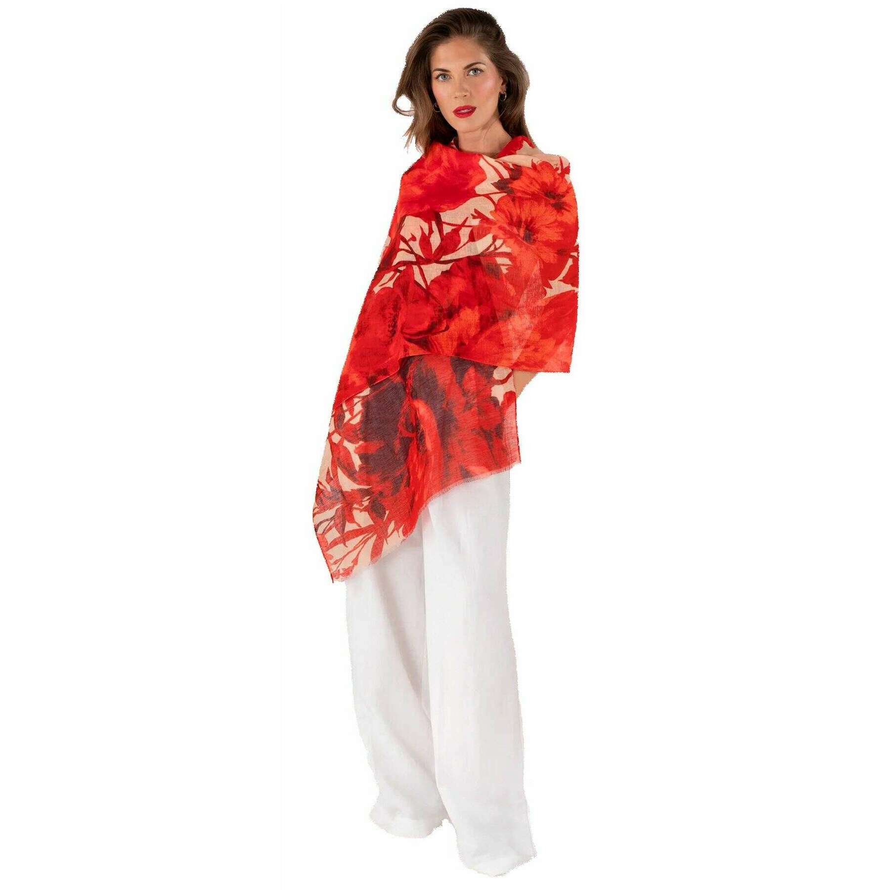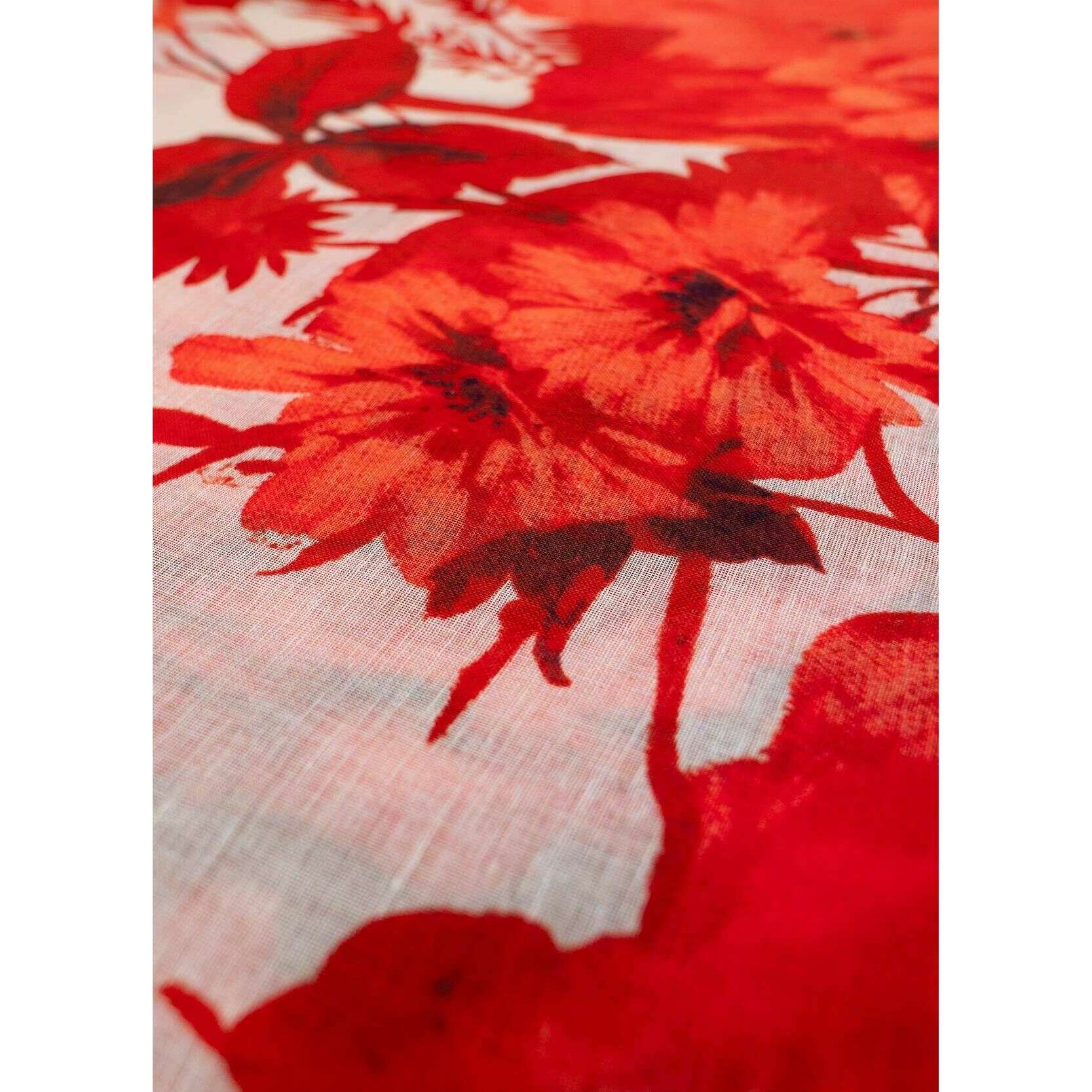 Powder Rouge Blooms リネン コットン スカーフ - レッド/ベージュ