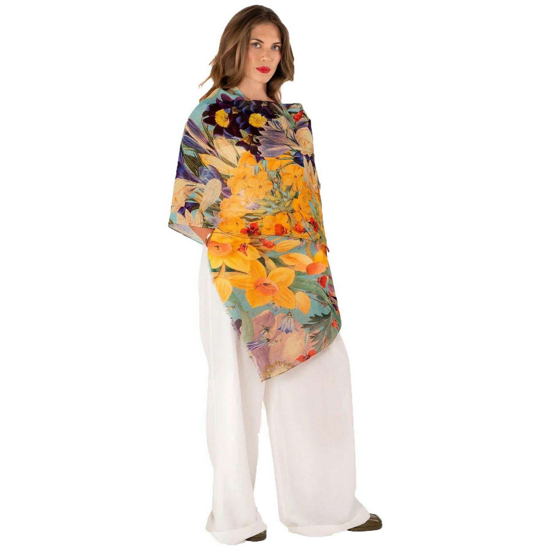 パウダースプリングフローラリネンコットンスカーフ - イエロー/ブルー/ベージュ