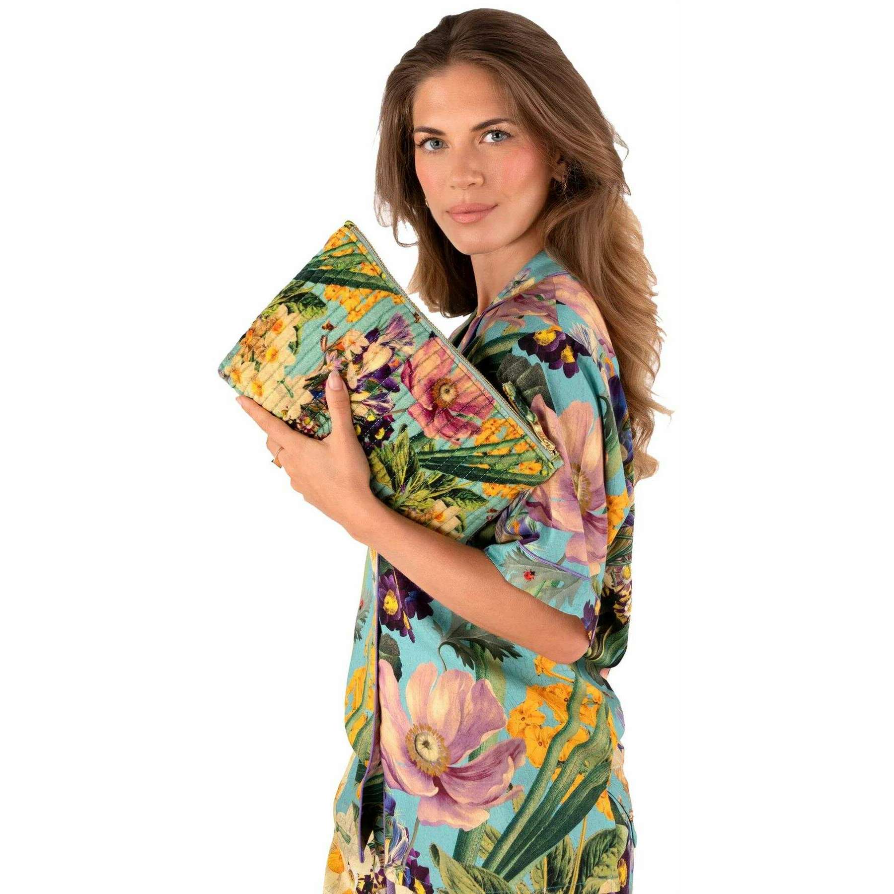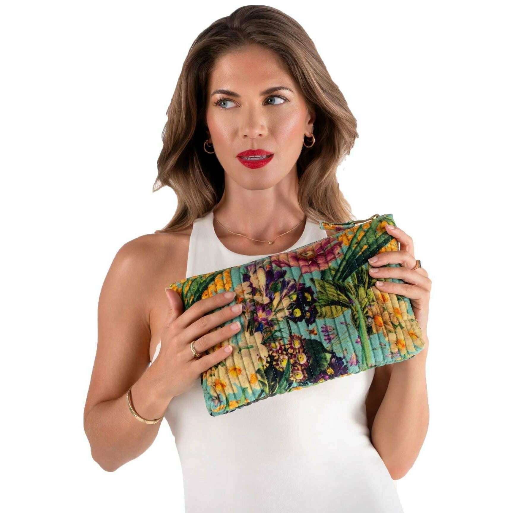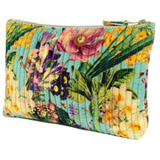 パウダー スプリング フローラ キルティング ベルベット ジップ ポーチ - ブルー/ベージュ/グリーン