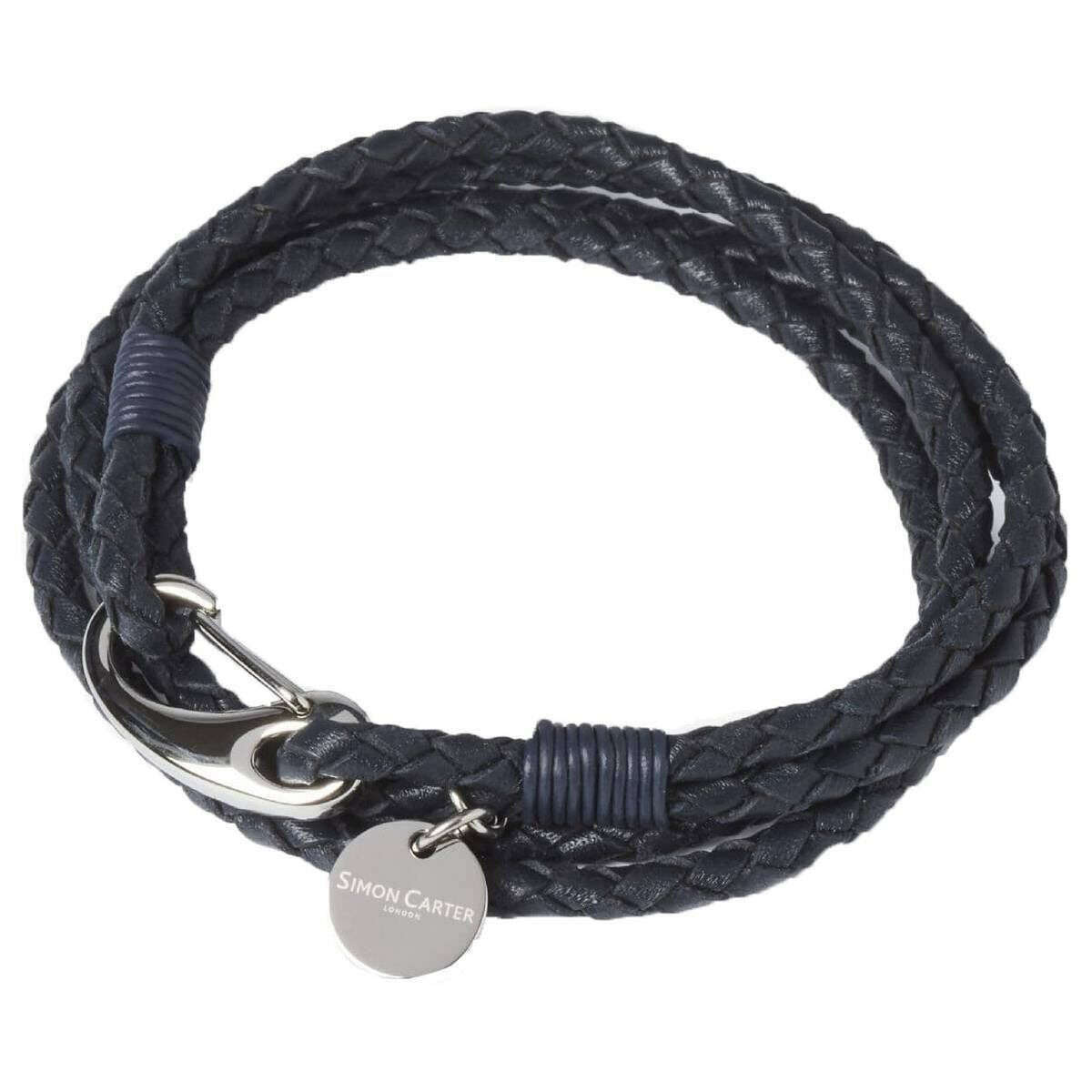 This padstow bracelet for men is fashioned by the brand Simon Carter 色はブルーで、ステンレススチールと革で作られています。すべてのブレスレットには、サイモン カーターのパッケージが付属しています。の Simon Carter パドストウ ブレスレット - ネイビー ブルー/シルバーは、カジュアルな日常着に最適です。このブレスレットは、手首に 2 回巻き付ける、トレンディなブルーの編み込みデザインが特徴です。 A ロブスタークロークラスプにより、このブレスレットは手首にしっかりと固定されます。