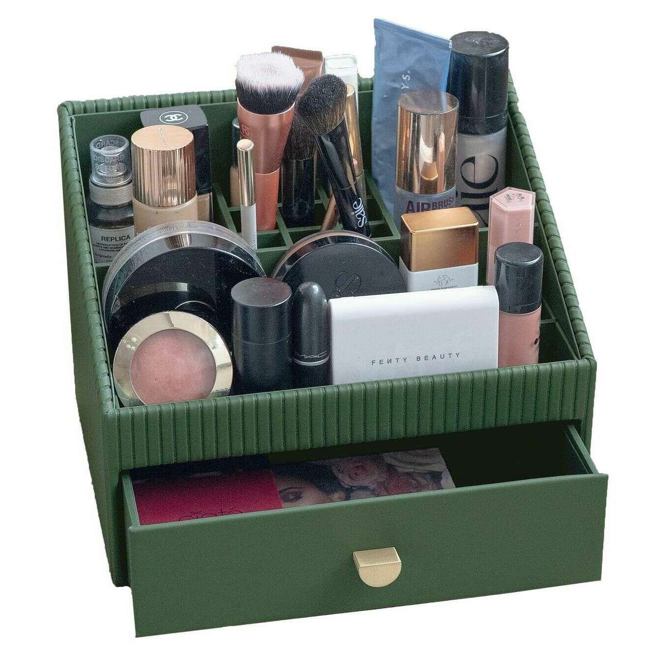 ブランドのこの女性用クラシックメイクアップオーガナイザー Stackers フェイクレザーとPVCで作られており、色はグリーンです。大きさは19cm(高さ)×25cm(幅)×18cm(奥行き)です。すべてのメイクアップオーガナイザーにはスタッカーパッケージが付属しています。の Stackers クラシックなメイクアップオーガナイザー - エメラルドグリーンには、メイクアップやスキンケア製品を収納できる複数のコンパートメントが付いています。この美しいリブ編みのグリーンのメイクアップオーガナイザーは、大きな製品を収納できるので、整理整頓とスペースの節約に最適です。