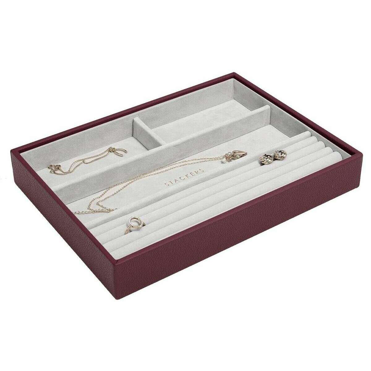 女性にぴったりなのはこれ Stackers バーガンディのクラシックなリングブレスレットレイヤー、これもフェイクレザーとベルベットで作られています。サイズは3.7cm(高さ)×25cm(幅)×18cm(奥行き)です。すべてのジュエリー ボックスにはスタッカー包装が施されています。の Stackers クラシック リング ブレスレット レイヤー - バーガンディは、すべてのリングとブレスレットに複数のセクションを備えています。この美しいクラシックなバーガンディ ジュエリー レイヤーは、整理整頓に最適です。