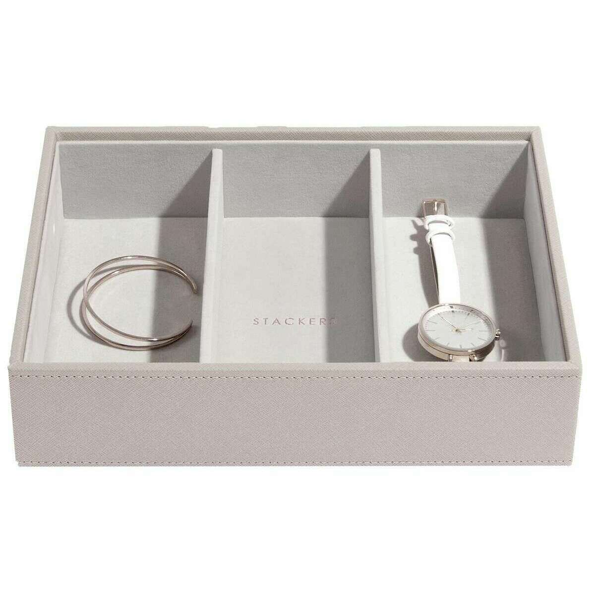 フェイクレザーとベルベットで作られた、デザイナーによるトープ ラフィアの女性用クラシック ジュエリー ボックス 2 個セットです。 Stackers. 大きさは11cm(高さ)×25cm(幅)×18cm(奥行き)です。すべてのジュエリー ボックスにはスタッカー包装が施されています。の Stackers クラシックなジュエリーボックス2個セット - トープラフィアは、ユニークなトープラフィアジュエリーボックスのデザインが特徴です。このジュエリーボックスは、すべてのジュエリーアイテムを保管するのに最適です。イヤリングとブレスレット用の 2 つの層と複数のサイズのセクションと、時計とバングル用の大きなセクションが付属しています。