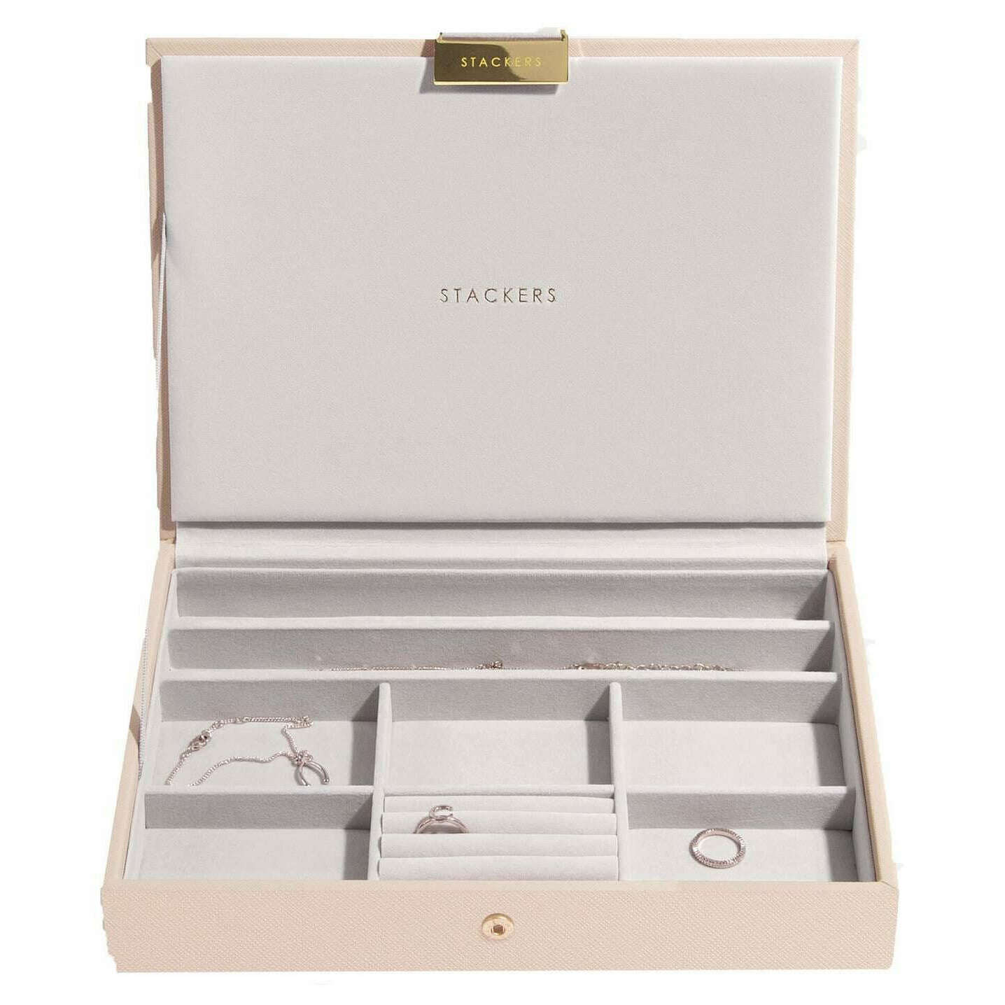 ピンクのフェイクレザーとベルベットを使用した、このクラシックなジュエリー ボックス 3 個セット。 Stackers 女性に最適で必須アイテムです。サイズは13.7cm(高さ)×25cm(幅)×18cm(奥行き)です。すべてのジュエリー ボックスにはスタッカー包装が施されています。の Stackers クラシックなジュエリーボックス3個セット - ブラッシュピンクウーブンは、ユニークなピンクのウーブンジュエリーボックスデザインが特徴です。このジュエリーボックスは、すべてのジュエリーアイテムを保管するのに最適です。イヤリング、リング、ブレスレット用の 3 つの層と複数のサイズのセクションと、時計とバングル用の大きなセクションが付属しています。