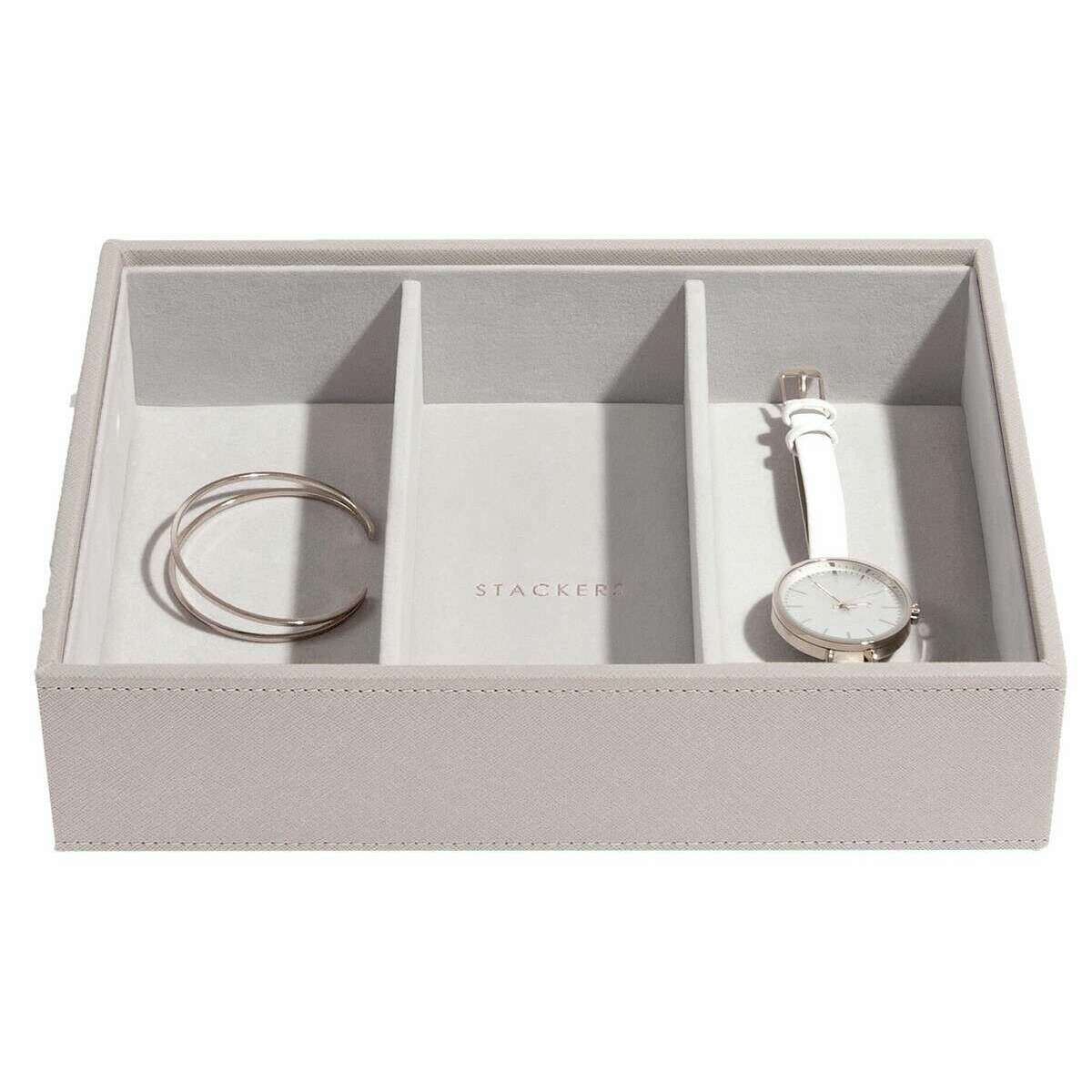 フェイクレザーとベルベットで作られた、デザイナーによるトープ色の女性用クラシック ジュエリー ボックス 4 個セットです。 Stackers. サイズは19.5cm(高さ)×25cm(幅)×18cm(奥行き)です。すべてのジュエリー ボックスにはスタッカー包装が施されています。の Stackers クラシックなジュエリーボックス4個セット - トープは、クラシックなトープのジュエリーボックスデザインが特徴です。このジュエリーボックスは、すべてのジュエリーアイテムを保管するのに最適です。イヤリング、リング、ブレスレット用の 4 つの層と複数のサイズのセクションと、時計とバングル用の大きなセクションが付属しています。