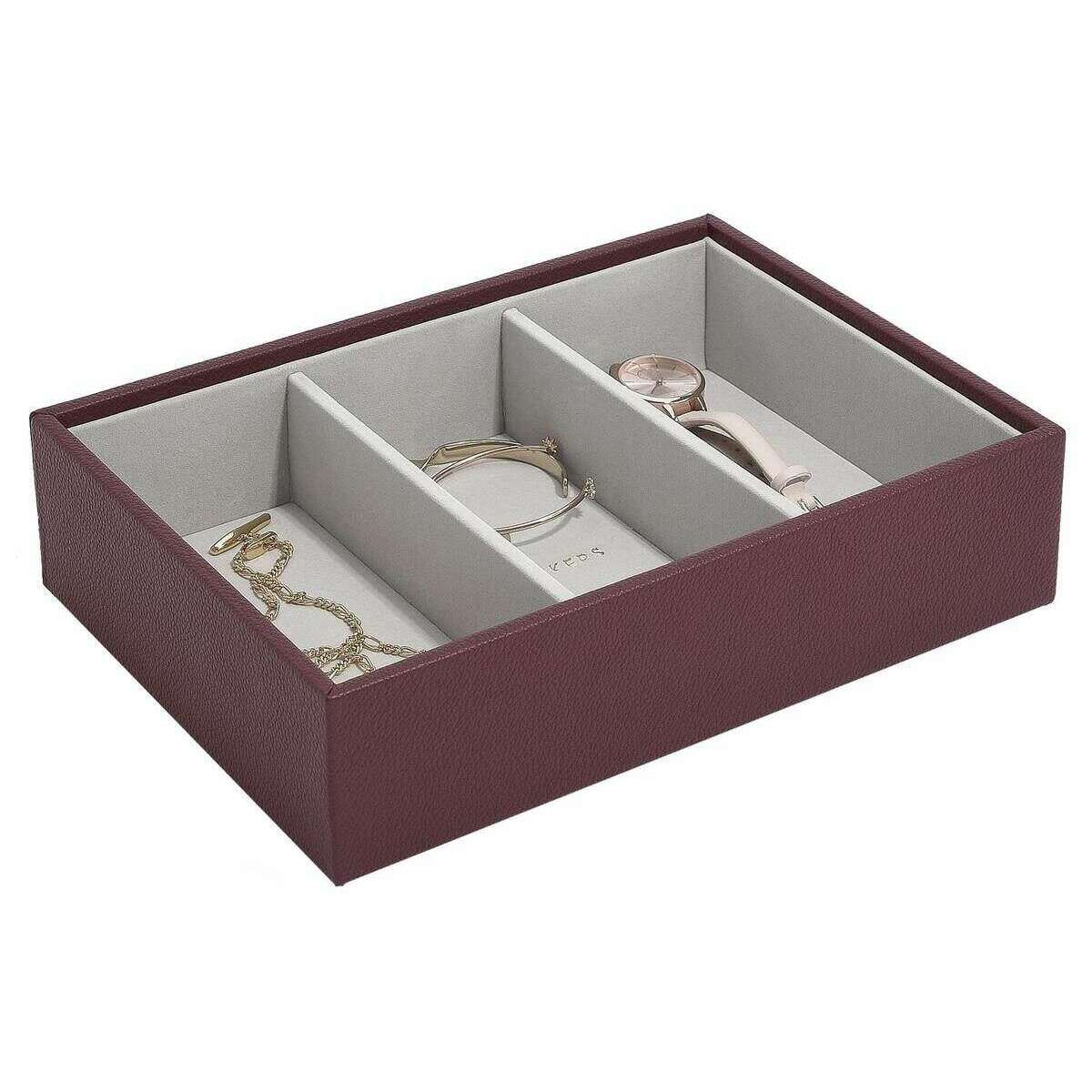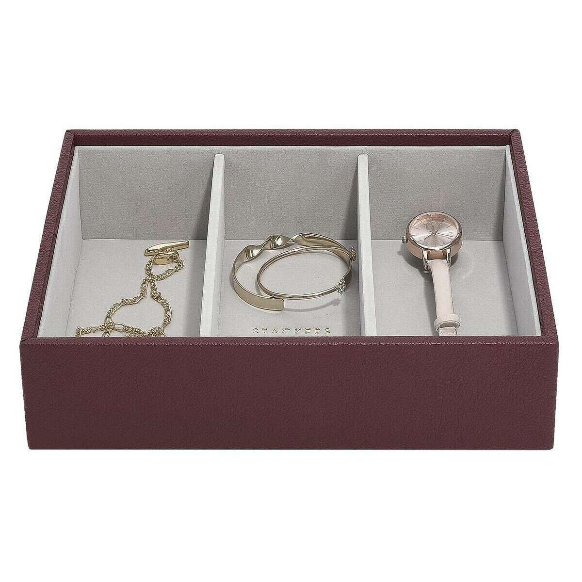 バーガンディのフェイクレザーとベルベットを使用したこのクラシックな時計アクセサリーレイヤーは、 Stackers 女性に最適で必須アイテムです。サイズは6cm(高さ)×25cm(幅)×18cm(奥行き)です。すべてのジュエリー ボックスにはスタッカー包装が施されています。の Stackers クラシックな時計アクセサリー レイヤー - バーガンディには、大きなジュエリー アイテムを収納できる 3 つの大きなセクションがあります。この美しいワインレッドのジュエリー層は、サングラス、時計、バングルなどの大きなアイテムの保管に最適です。