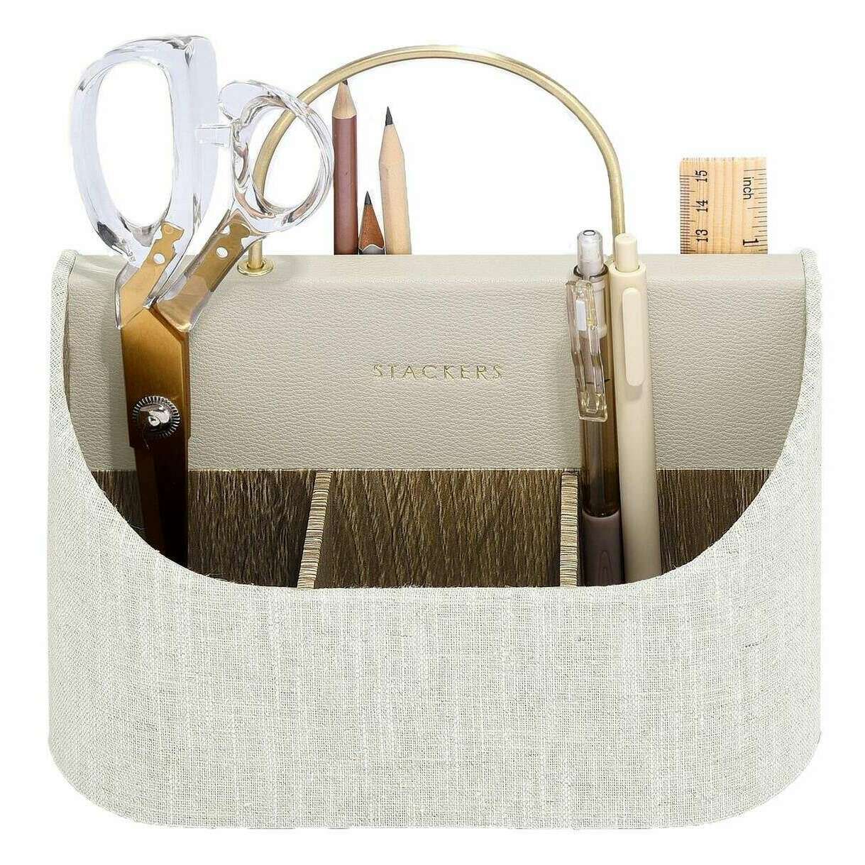 この女性用デスクキャディはブランドによって作られています Stackers ベージュ色で、合成皮革製です。サイズは21cm(高さ)×21cm(幅)×13cm(奥行き)です。すべてのデスクアクセサリにはスタッカーのパッケージが付属しています。の Stackers デスクキャディ - オートミールベージュ/リネンベージュはどんなデスクにも欠かせないアイテムです。このベージュのデスクキャディは文房具の保管に最適で、持ち運びに便利なハンドルも付いています。