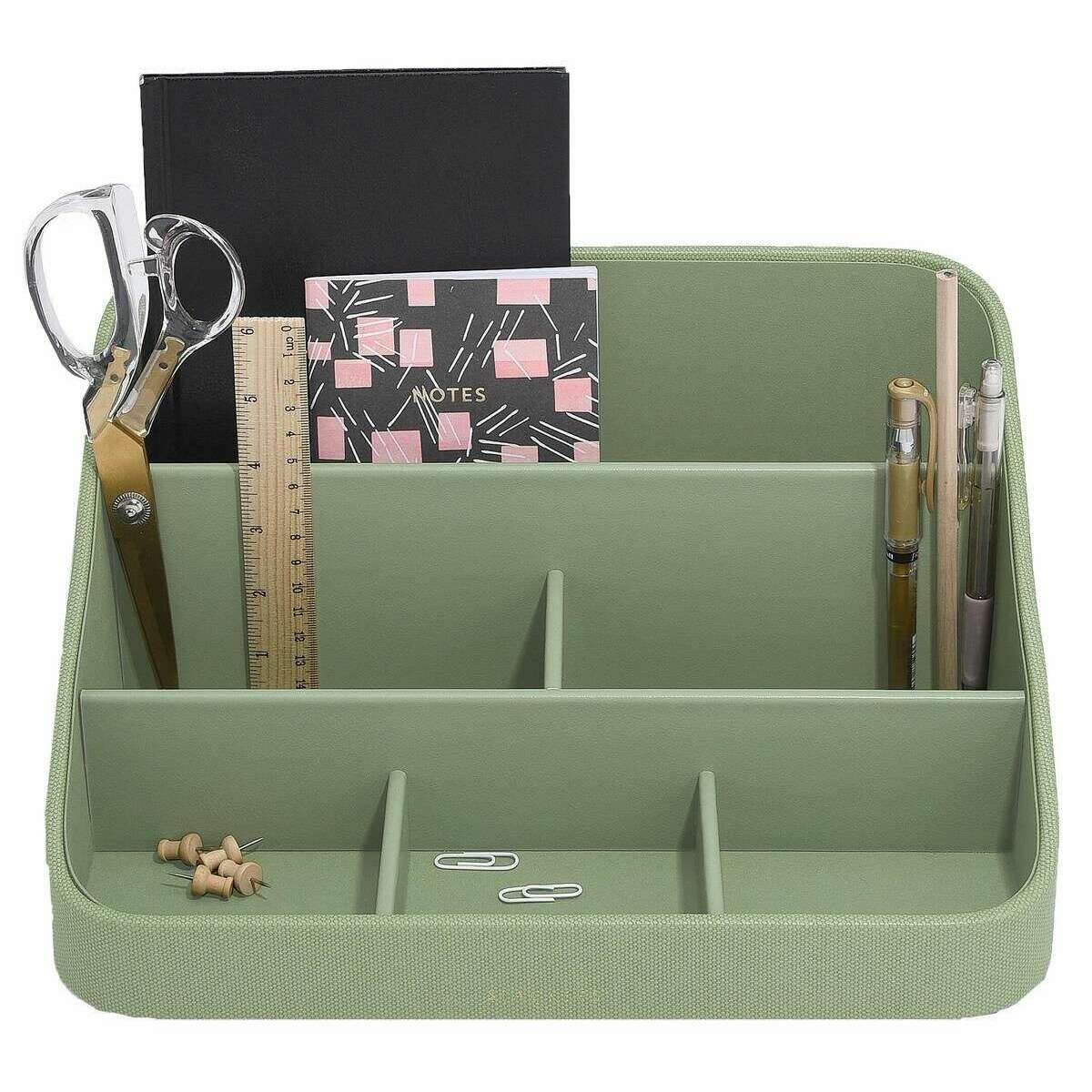 この女性用デスクオーガナイザーセットをご紹介します。 Stackers, ピスタチオグリーン色の合成皮革で作られています。サイズは20cm(高さ)×25cm(幅)×33cm(奥行き)です。すべてのデスクアクセサリにはスタッカーのパッケージが付属しています。の Stackers デスク オーガナイザー セット - ピスタチオ グリーンは、美しいグリーンのデザインが特徴です。このデスクオーガナイザーには、文房具、ノート、その他多くの小物を収納できるセクションがたくさんあります。追加の収納のためのレタートレイが付属しています。