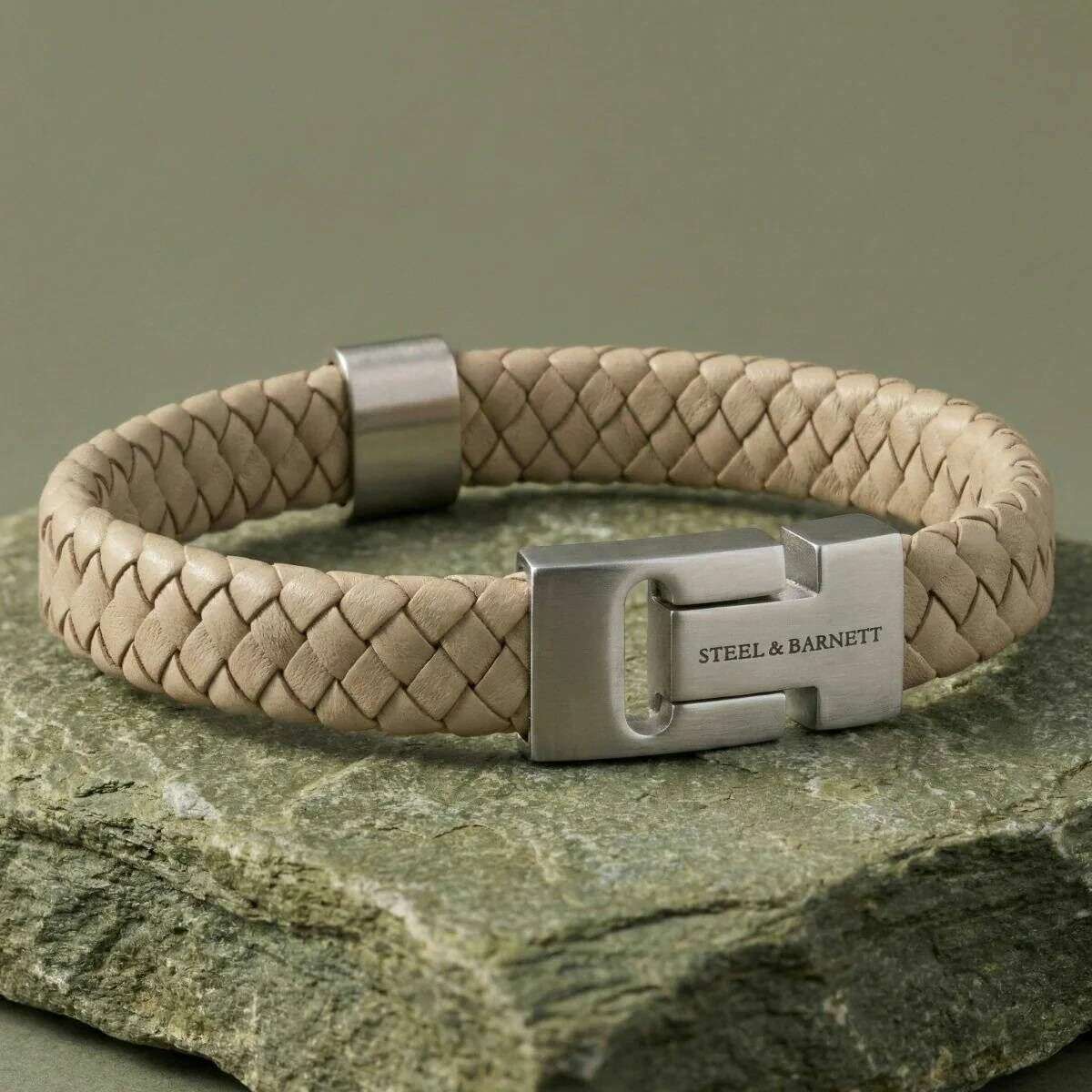 デザイナー Steel & Barnett による、100% ナッパ レザーとステンレススチールで作られたエクリュ クリームのメンズ ハリソン 厚い編み込みレザー ブレスレットです。すべてのブレスレットにはスチールとバーネットのパッケージが付属しています。 Steel & Barnett Harrison 厚手の編み込みレザー ブレスレット - エクリュ クリームは、プレミアムな職人技と洗練されたデザインの洗練された融合を示しています。 100% 本物のナッパレザーから手作りされ、厚く複雑に編み込まれた構造は、耐久性と時代を超えた魅力の両方をもたらします。幅 12 mm で、威厳がありながらも多彩な存在感を放ち、さまざまなルックスを引き立てます。ブレスレットは、強度と耐食性に優れた 316L ステンレススチール製のブラッシュドスチールクラスプで仕上げられています。マグネット式の留め具により、安全かつ楽に閉めることができ、スタイリッシュであると同時に実用的です。現代のプロフェッショナルにぴったりのハリソンは、ビジネス服装とカジュアルウェアの間をシームレスに切り替え、あらゆるアンサンブルに独特のタッチを加えます。