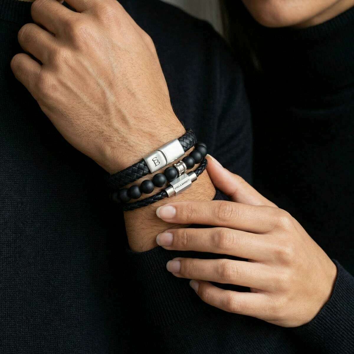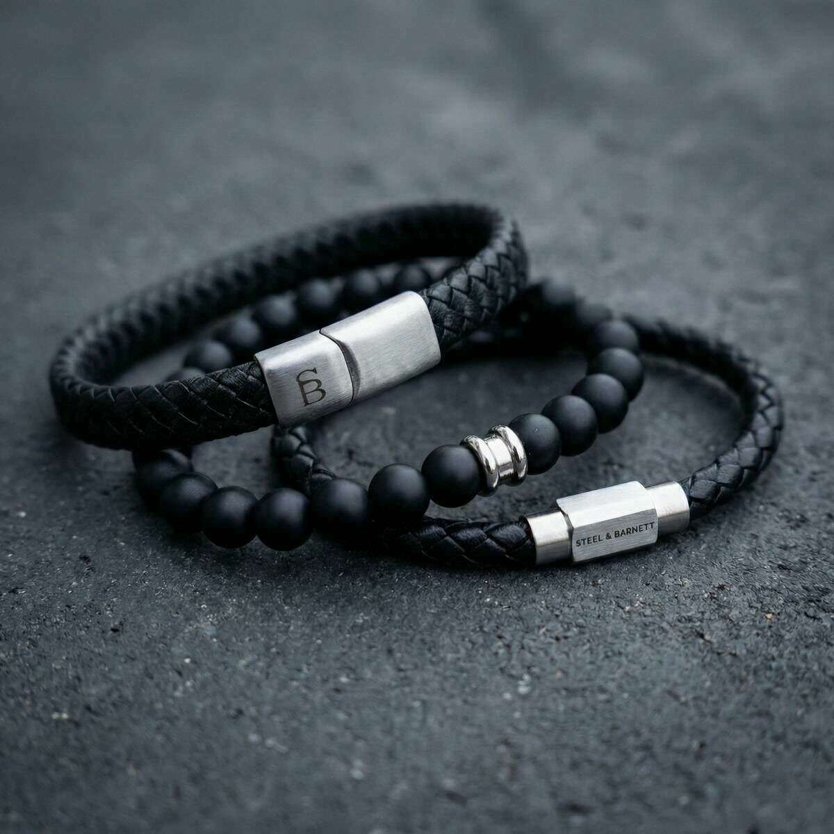 Steel & Barnett によるメンズ トリプル ブレスレット ギフト セットのご紹介です。100% レザー、ステンレススチール、ブラック/シルバー色の宝石で作られています。すべてのブレスレットにはスチール&バーネットのギフトボックスが付属します。スチール & バーネット トリプル ブレスレット ギフト セット - ブラック/シルバーは、洗練されたスタイルと多様性を重視する現代の個人向けにデザインされた、洗練されたトリオです。この精選されたセットには、ステンレススチール ブレスレット、レザー ブレスレット、6 mm ラウンド ジェムストーン ブレスレットが含まれており、それぞれ控えめなエレガンスを醸し出すブラックトーンで作られています。これらの作品は、鋼の強さ、革の時代を超越した魅力、そして磨かれた宝石の自然な魅力を組み合わせた、質感とデザインの調和のとれたバランスを生み出します。別々に着用して微妙なインパクトを与える場合でも、重ね着してより大胆な表現をする場合でも、このセットはどんなワードローブにも簡単に適応します。