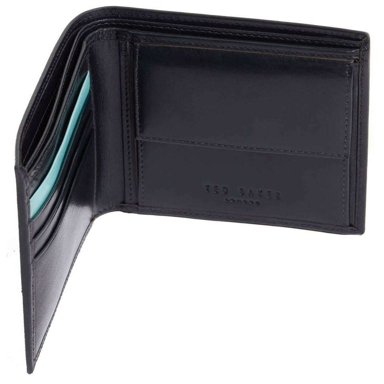 デザイナー Ted Baker ネイビーを基調とした牛革100%のメンズ財布をご紹介します。サイズは9cm(高さ)×11cm(幅)×2cm(奥行き)です。すべての財布はTED BAKERのギフトボックスに入った状態でお届けします。の Ted Baker Prugs メタル コーナー 二つ折り財布 - ネイビーは洗練されたポリッシュ レザー仕上げで、上に箔ロゴが付いたエンボス加工のテクスチャー コーナーが特徴です。開くと 4 つのカード スロット、スナップボタン付きのコイン ポケット、2 枚の紙幣用コンパートメントがあり、必需品をすべて収納できる十分な収納力を備えています。